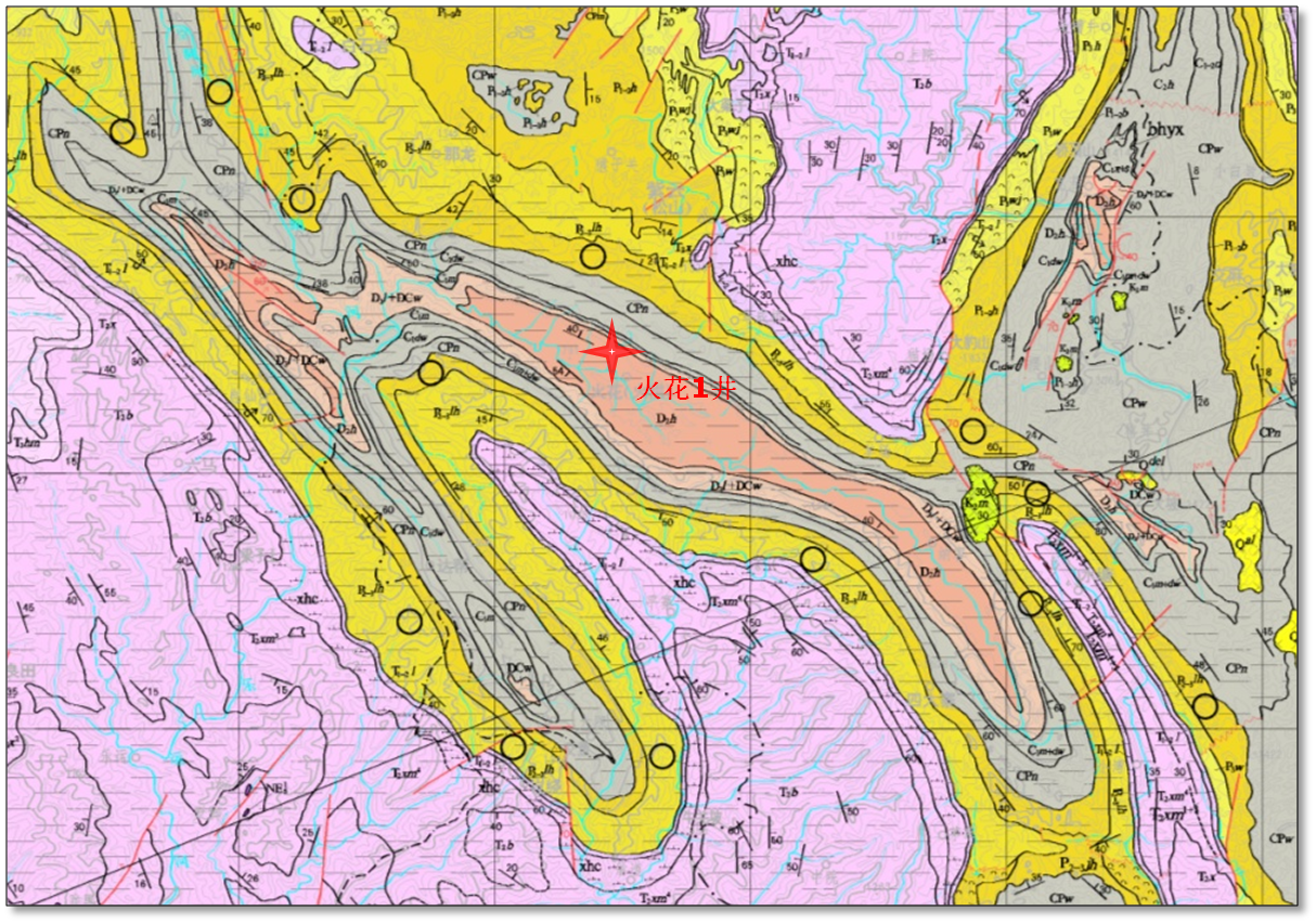 火花1井作为紫云片区页岩气地质调查的第二口油气地质调查井,主要钻探目的为获取钻井地质资料,尤其是目的层泥盆系火烘组的岩性变化特征、地层层序、沉积相等相关资料;进一步确定晚古生代泥盆系富有机质泥页岩(烃源岩)的空间展布情况及发育特征。目前该井正顺利钻探中,后续做好随钻跟踪工作。