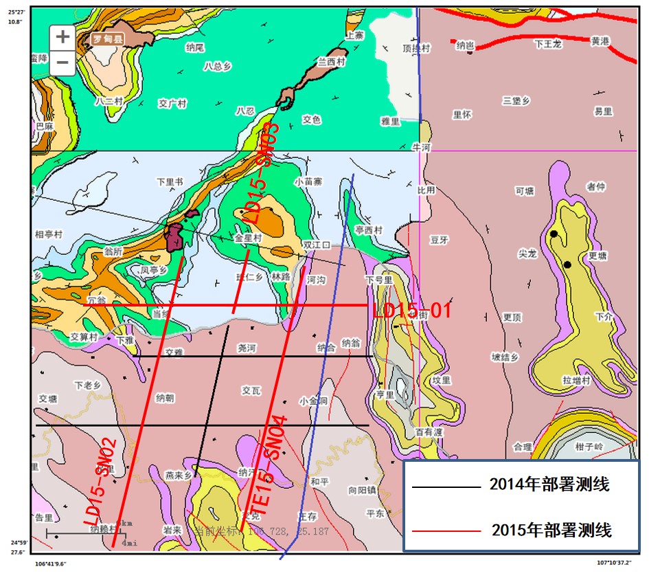 《广西天峨地区页岩气地质调查二维地震勘探(追加)工程》是中国地质调查局油气资源调查中心在广西天峨地区部署的二维地震勘查工程。2014年在该区开展了60km二维地震数据采集、处理、解释工作,并已完成了阶段验收工作。通过项目的实施与阶段性验收,经过局油气调查中心、中石化勘探分公司、中国地质科学院等相关单位的专家评审、研讨、分析,认为该区域存在一定的有利条件,为进一步查清目标层下石炭统、中上泥盆统黑色页岩层的展布,落实纵向上各层系有利页岩的发育情况,经专家组讨论,追加工作量满覆盖剖面长度68km(图1)。