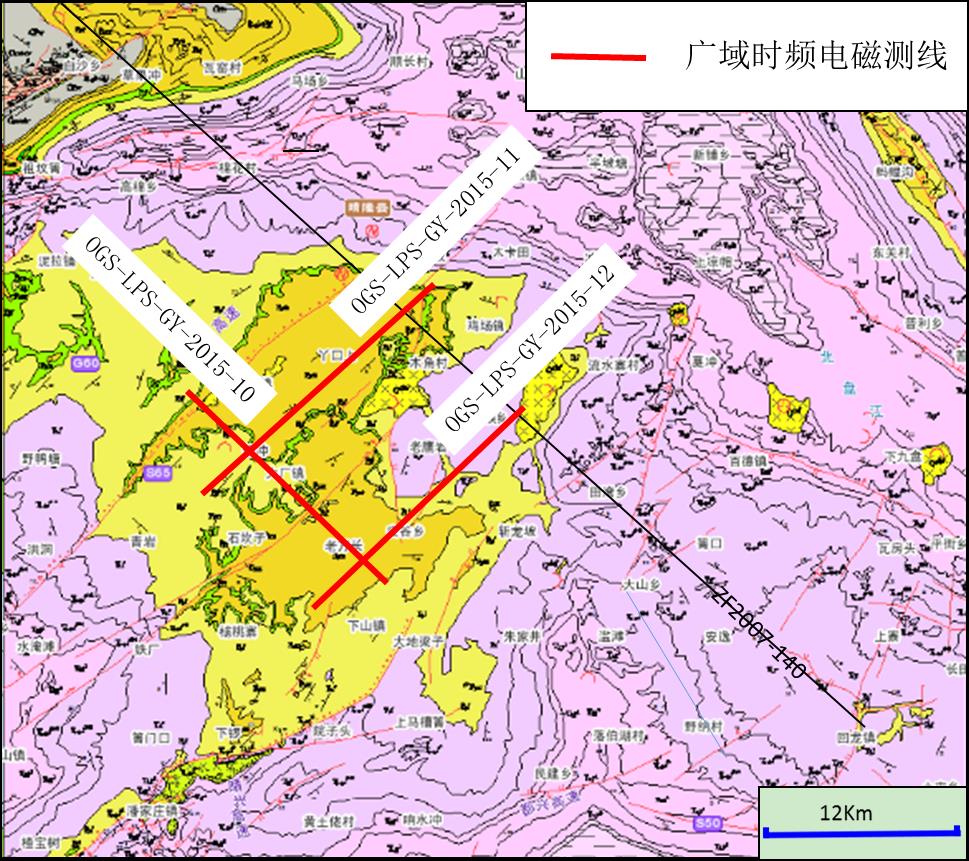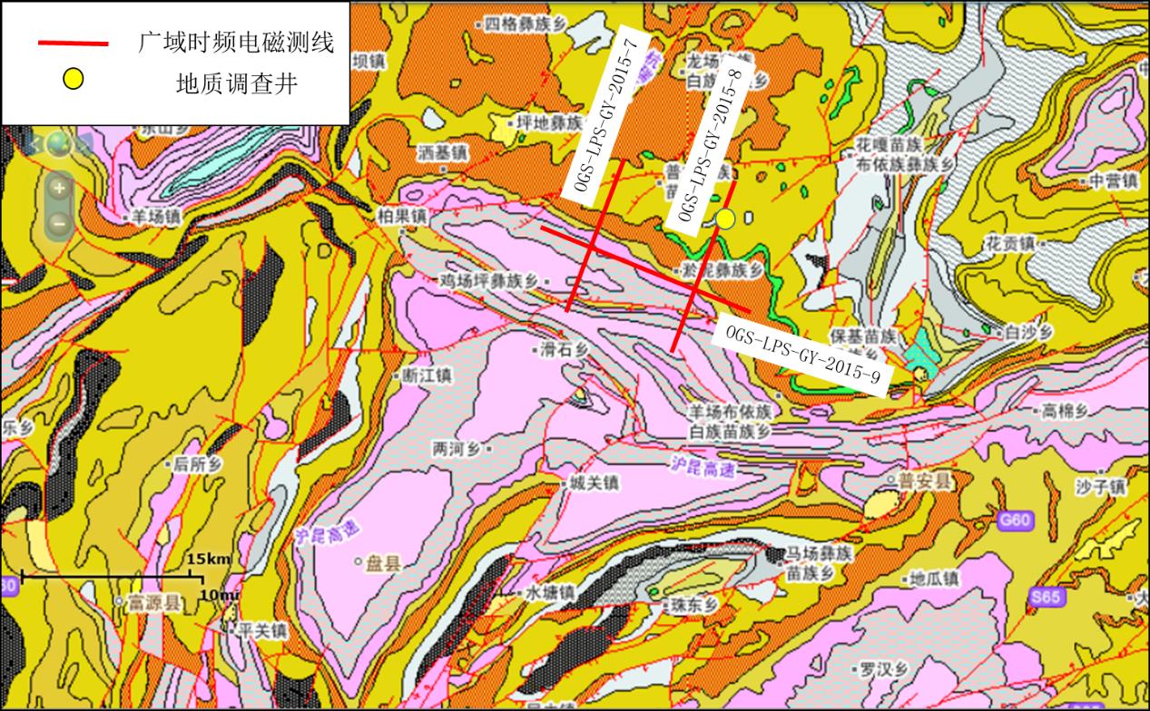 《贵州六盘水地区广域电磁法勘探工程》是中国地质调查局油气资源调查中心在贵州黔西地区部署的二维地震勘查工程,该工程由中南大学承担。在充分收集和研究前人地质、地球物理等资料的基础上,开展贵州黔西六盘水地区时频/广域电磁法剖面测量200km,其中六盘水市水城地区部署测线100km,水城-盘县地区部署测线50km,晴隆地区部署测线50km(图1、图2、图3)。查明区内地球物理场分布规律和特征,落实区内断裂构造特征,明确泥页岩分布特征。主要目的层为下石炭统打屋坝组,兼探泥盆系火烘组。
