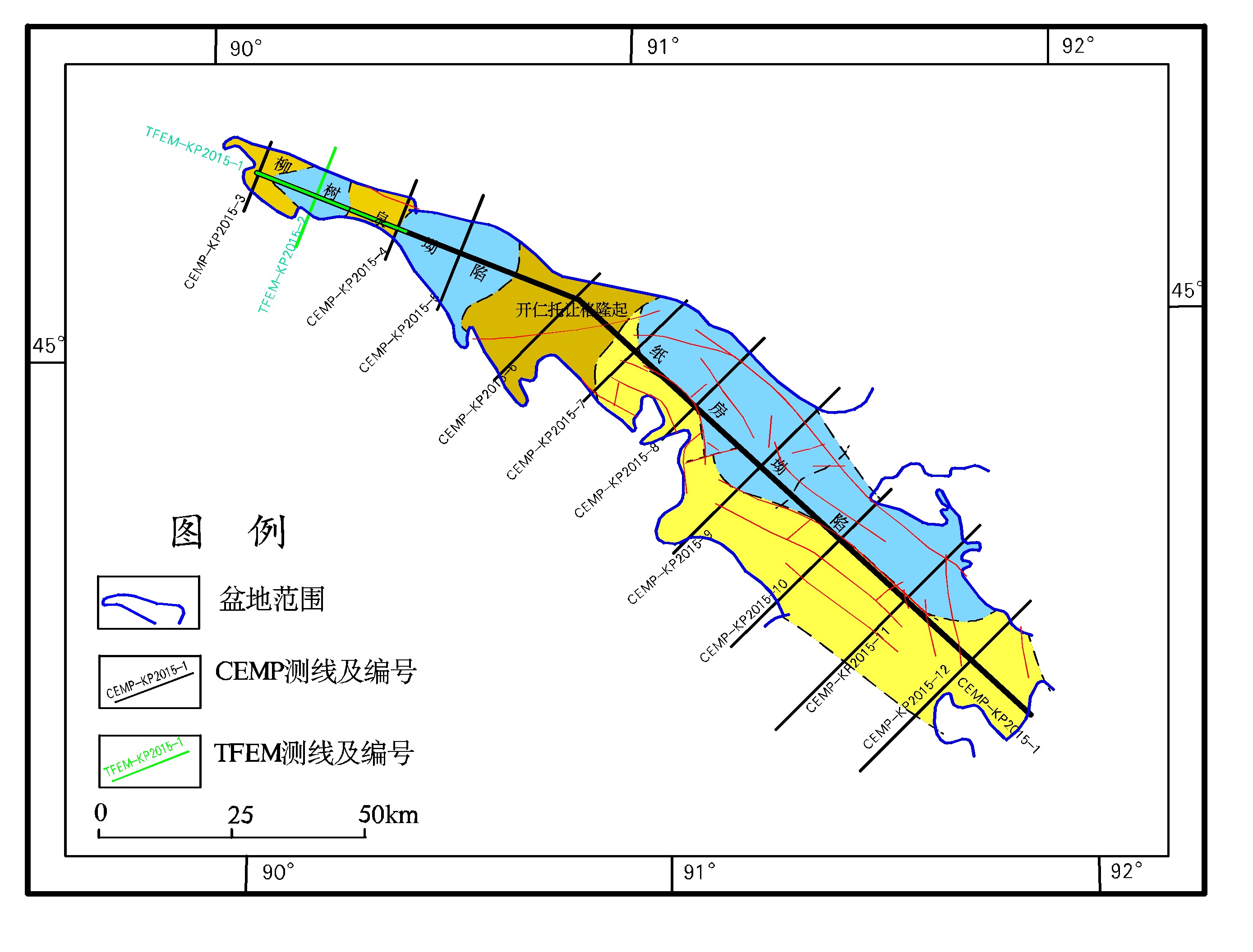 库普盆地CEMP、TFEM测线工区位置图