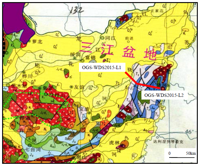 工区位于松辽东部外围三江盆地东部的完达山地区,该区重力呈现椭圆状低值异常,周边为高值区,最低值区地表有花岗岩出露,推测深部有低密度体即一定规模的侏罗系-白垩系地层,存在完达山隐伏盆地,具有一定生烃能力。结合以往的二维地震工作成果,在该区部署二维地震工程,本地震工程共部署地震测线两条,满覆盖70km,采用两线、单点4串检波器组合接收和大药量激发的施工因素,保证资料品质。本地震工程主要目的是是查明完达山隐伏盆地规模与地层展布,同时,揭示完达山地体与佳木斯地体关系。