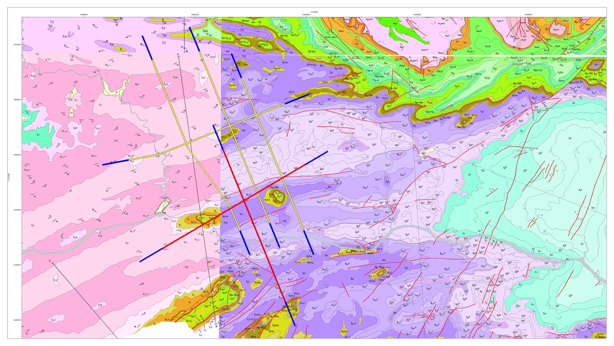 二维地震采集工作部署示意图(红线部分)
