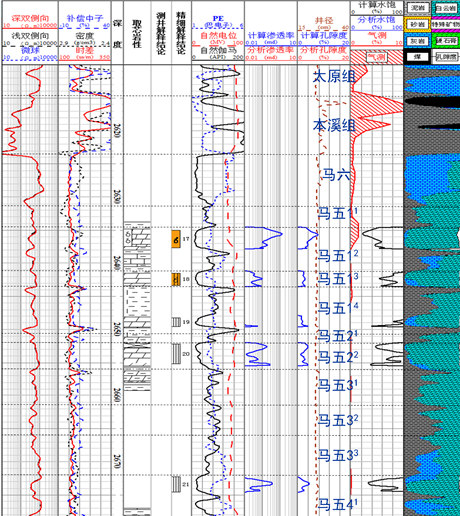 该井在奥陶系马家沟组马五段钻遇良好油气显示。综合利用录井、岩心、测井等资料,优选马五12+3段2635.0~2643.4m井段进行酸化压裂试气。射孔井段包括两段,采用深穿透油管传输射孔,其中马五12射孔段2635.0-2637.8m,厚2.8m;马五13射孔段2641.5-2643.4m,厚1.9m。