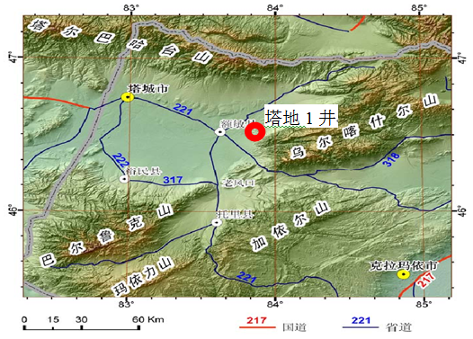 塔地1井是中国地质调查局油气资源调查中心(以下简称“油气中心”)在新疆塔城盆地部署的油气地质调查井。2015年8月中旬通过地质设计和钻探工程设计评审,2015年8月23日正式开钻。该井由油气中心负责组织管理、核工业二九〇研究所负责现场钻井施工。