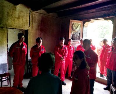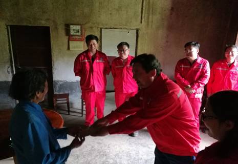 从鄂阳页1井开钻至今,我们已经在这片土地上与当地百姓共同生活了近3年,与他们建立起了深厚的感情。现在看到大娘孤单一人的苦日子,大家心里都不好过,6月13日,繁忙的压裂施工间隙,中国地质调查局油气资源调查中心勘查技术室联合页岩气室组织压裂施工各单位共同开展了一次别开生面的临时党支部学习交流会,参加交流会的有油气中心在驻现场的党员干部、中石化江汉井下测试公司部分党员干部、中石化江汉地球物理公司部分党员干部、现场信息化建设单位党员和现场压裂监督等共30多人。大家围绕如何帮大娘缓解生活困难展开了讨论,同志们一致表示在野外最前线,如何践行新时代党的十九大精神和习近平系列讲话精神,最重要的就是从点滴小事做起,热烈的讨论氛围下,大家逐渐对如何结合现场工作实际条件,伸出援助之手,帮助这些孤寡留守老人达成了共识。年轻的党员表示在工作之余会帮助老人干一些力所能及的农活,女同志则表示可以帮助老人收拾一下家务。最后大家都不约而同表示每人自愿捐款,用大家的力量帮助老人改善生活条件,就这样,你五十、他一百,大家共捐出了2000元现金。党支部活动会后,大家一起来到大娘家里,对大娘进行了端午节的慰问和捐助,看到这一群红衣服的真诚朴实的笑脸,大娘感动得热泪盈眶。