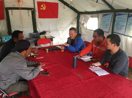 2018年7月24日,自然资源部中国地质调查局油气资源调查中心青南藏北项目野外临时党小组于西藏雀莫错QK-9井现场召开专题学习会,集中学习我们身边的榜样——十九大代表、“西藏工匠”向巴扎西同志。油气调查中心祝有海、肖睿以及西藏地勘局第六地质大队党员及入党积极分子参加了会议。