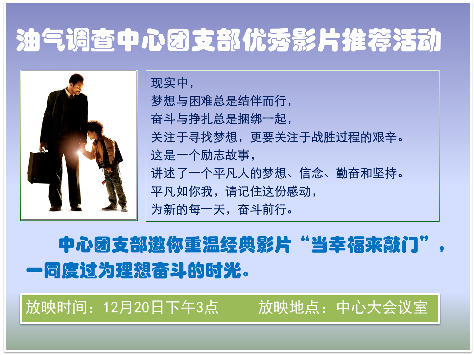 此次活动力行节俭,利用中心自有资源和场地,于2013年12月20日举行了第一期优秀影片放映活动。推荐影片《当幸福来敲门》讲述了一个平凡人的梦想、信念、勤奋和坚持。旨在鼓励中心广大青年在怀抱理想的同时,更要勇于直面理想实现过程中的困难,不忘初衷保持奋斗前行的动力。此次观影活动在青年中引起强烈共鸣。