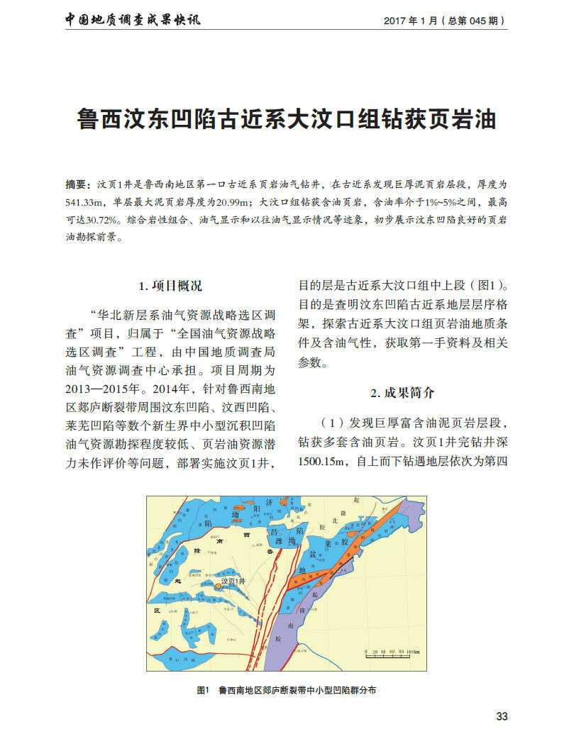 鲁西汶东凹陷古近系大汶口组钻获页岩油
