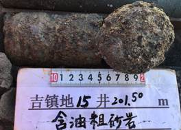 其中,吉镇地15井在上白垩统姚家组198.1-220.6m井段钻遇含油显示砂岩层段12层,累计厚度15.5米(图2)。其中,富含油层段2米(图3)、油浸层段7.8米(图4)、油斑层段5.7米。