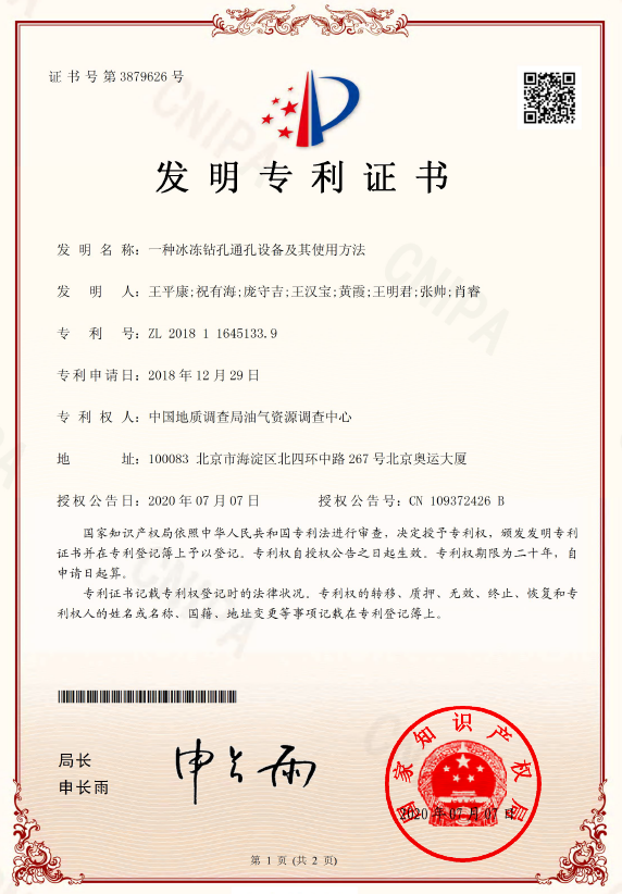 近日,由自然资源部中国地质调查局油气资源调查中心研发的“一种冰冻钻孔通孔设备及其使用方法”获得国家发明专利授权,专利号ZL 2018 1 1645133.9。