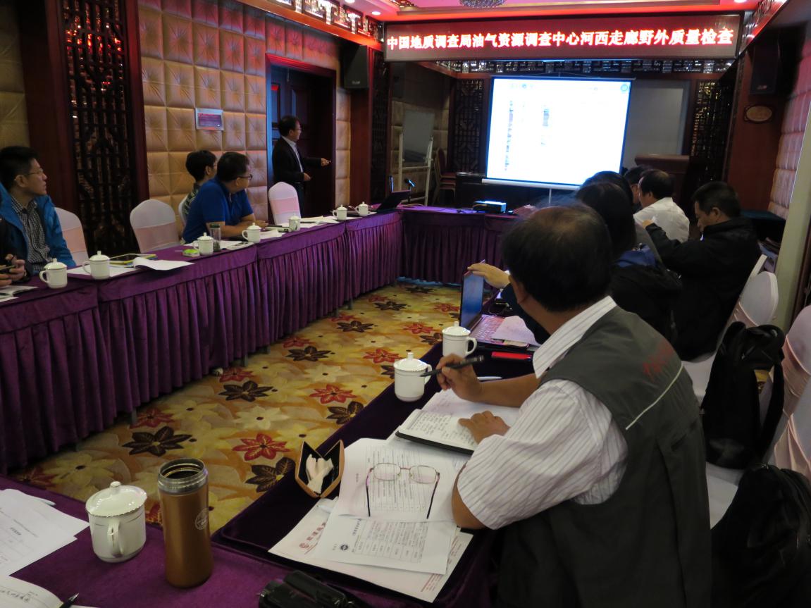 9月24日上午,检查组首先听取了“敦煌盆地油气基础地质填图”、“民乐盆地油气基础地质填图”、“敦煌盆地地震资料处理解释及石油地质条件调查”、“河西走廊重点盆地烃源岩调查”、 “河西走廊盆地群侏罗系沉积储层研究”、“木里盆地煤层气资源远景调查”6个专题野外工作进展情况汇报,随后检查了各专题野外原始记录及初步成果资料,主要包括野外记录本、项目组自互检记录表、采集样品记录及相关成果图件。