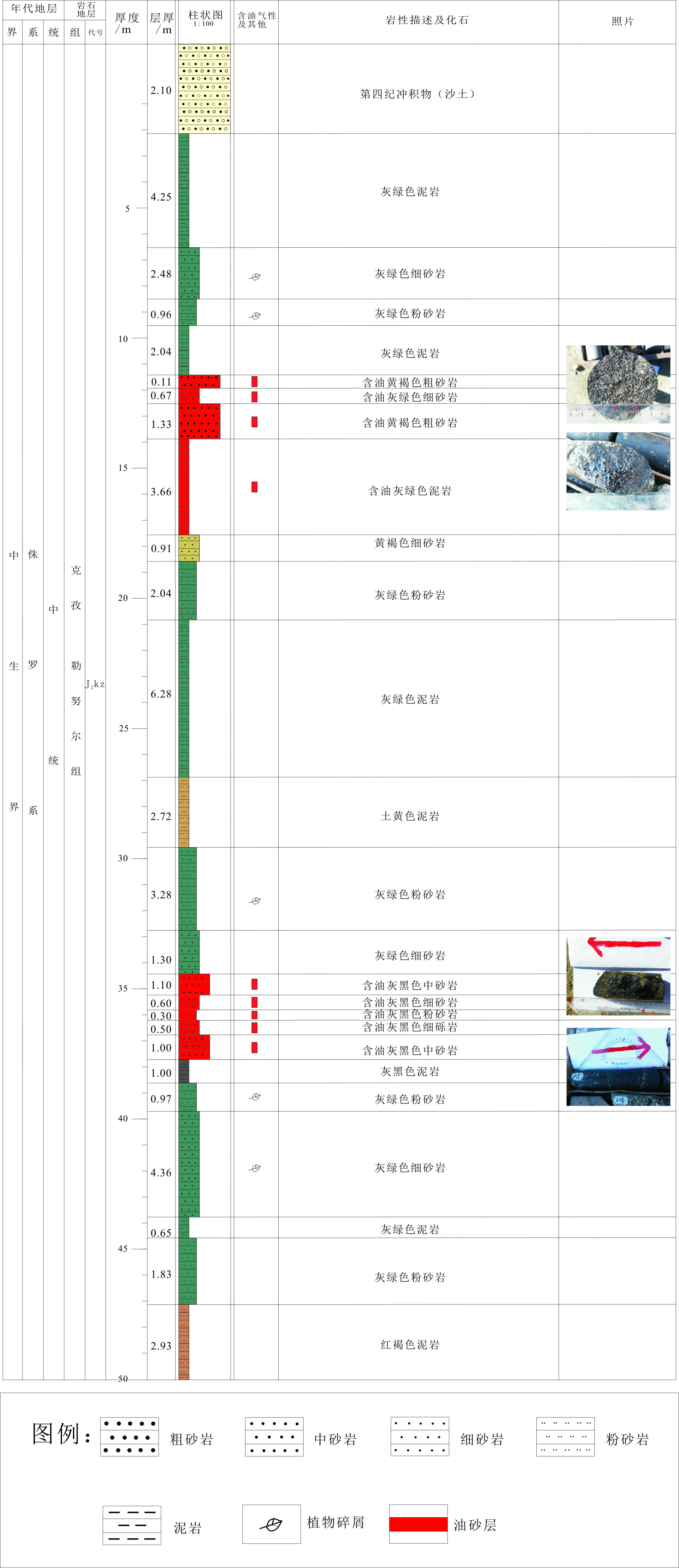 巴油砂1井获取了该区侏罗系克孜勒努尔组地层资料、油砂厚度及含油率等关键评价参数,为研究该区油砂资源分布规律、富集条件和主控因素提供基础数据资料。下一步工作将以细化地层对比、岩心样品测试分析为主,为系统评价塔里木盆地库车坳陷侏罗系油砂的资源潜力奠定基础。