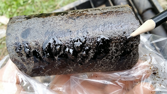 为更好地了解该套油砂的含油性特征,项目组实地考察了正钻的油砂调查井JK-3井,该井位于江油市二郎庙镇辛家沟村,目的层为侏罗系沙溪庙组,在175-181m井段,钻获厚约5米的饱和含油油砂岩心,岩心断面饱含油面积80-100%,原油呈深褐色-灰黑色,外溢岩心表面。通过考察发现该区侏罗系油砂品质较好,但多数露头受到水流和植被覆盖的影响不易识别。