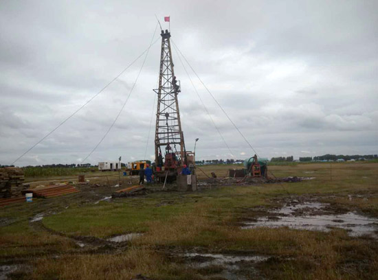 2016年9月11日,中国地质调查局油气资源调查中心针对松辽盆地西部斜坡带镇赉地区部署的油砂调查井——吉镇地1井正式开钻。该井位于吉林省白城市镇赉县东南部,目的层为白垩系姚家组,设计井深420米。本井为松辽盆地西斜坡油砂地质调查井钻探工程中实施的五口油砂钻井(吉镇地1井-5井)之一,通过公开招标程序确定承担单位为核工业二四三大队。为保证油砂矿心收率及矿心含油特征的真实性,本次钻探采用单管投球干钻取芯技术,矿心出筒后立即密封冷藏,最大限度减少烃类成分的氧化和挥发,保证岩心样品的测试准确性。