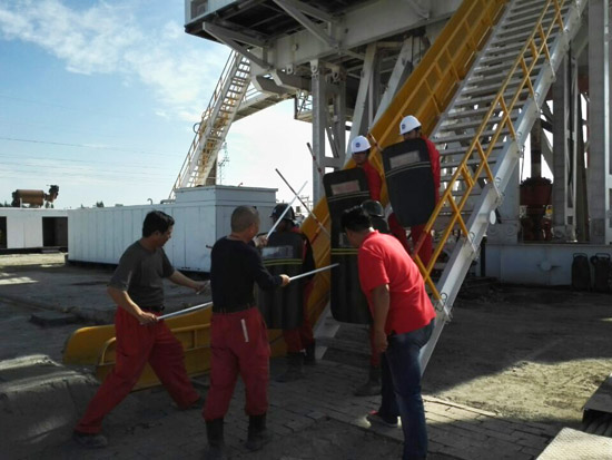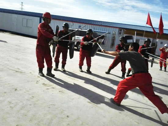 有三名“暴徒”手持凶器妄想强行闯入现场,值班工人第一时间拉响警报,启动防恐防暴应急预案。井场应急小组闻讯赶来增援,一边用防暴盾牌、胶棍与暴徒周旋,掩护工作人员回撤至钻井平台;一边立即拨打110报警,尽快争取外援。十分钟后,警察火速赶到现场,制服了“暴徒”,防暴防恐演练活动顺利结束。